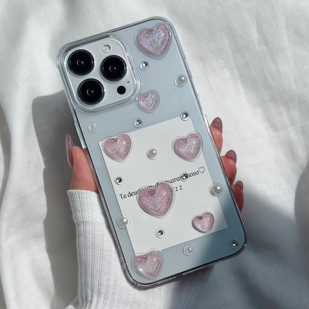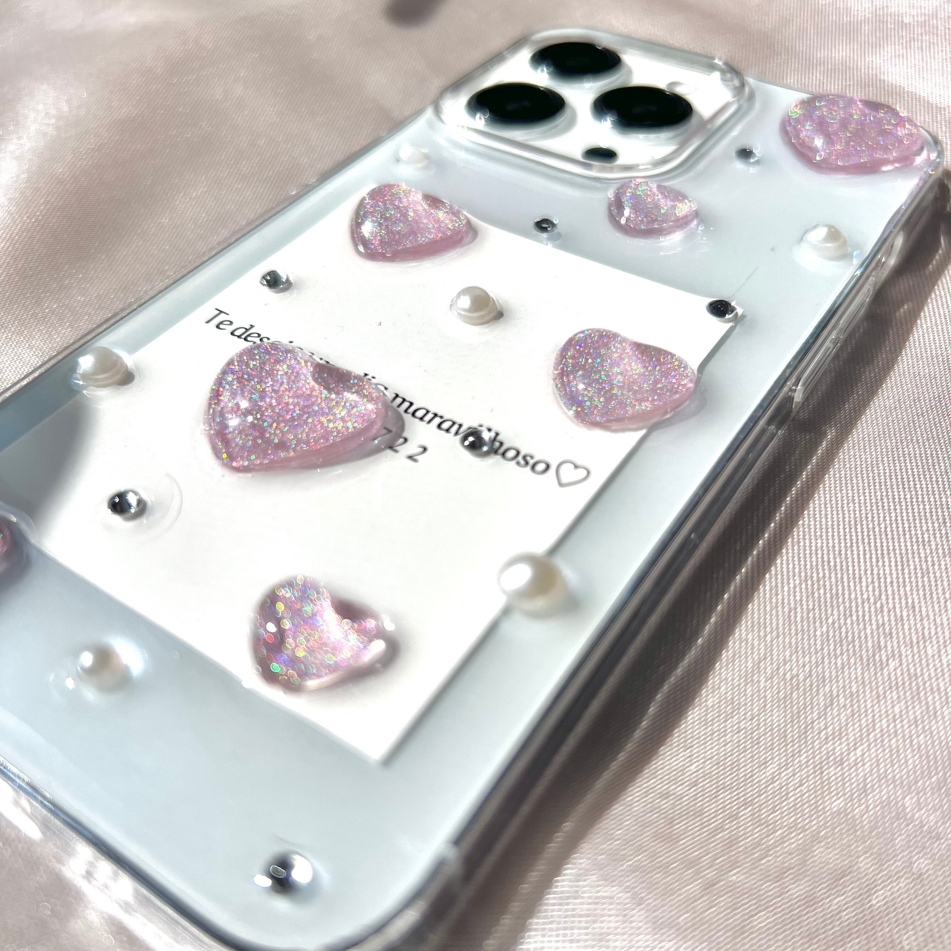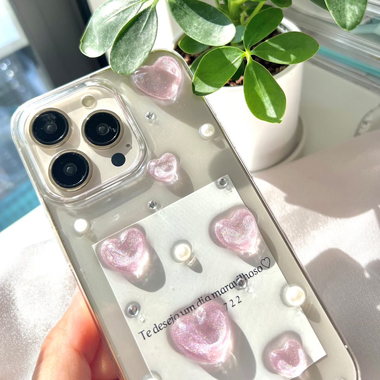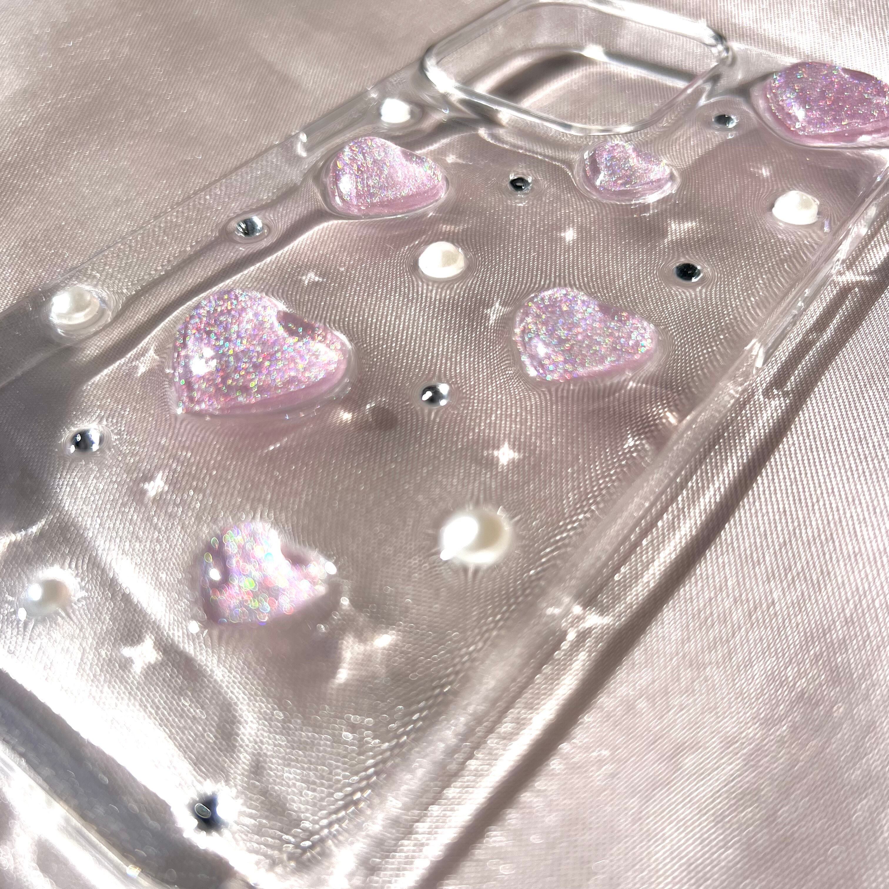 透明感たっぷりのクリアケースに、ぷっくり立体のピンクハートとビジュー、パールを散りばめました。