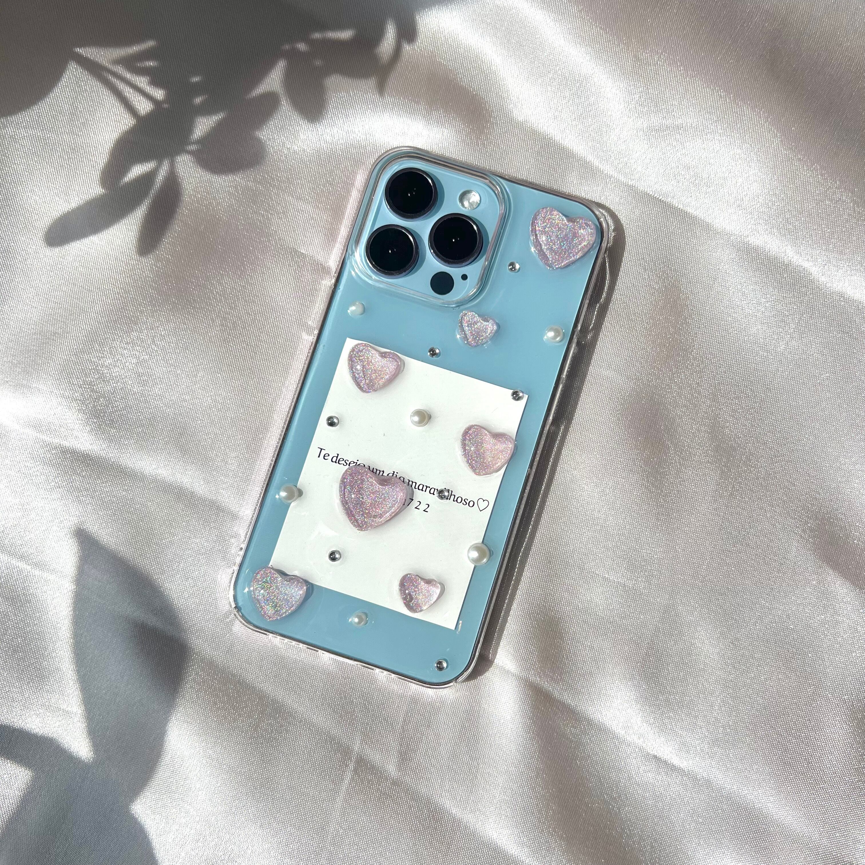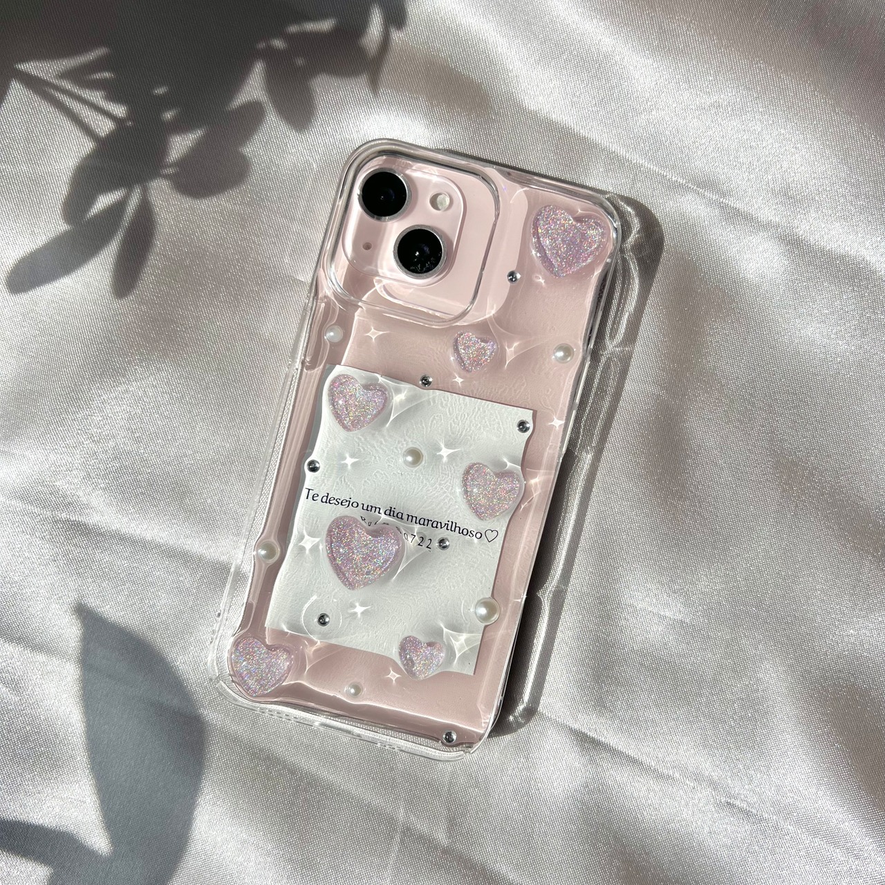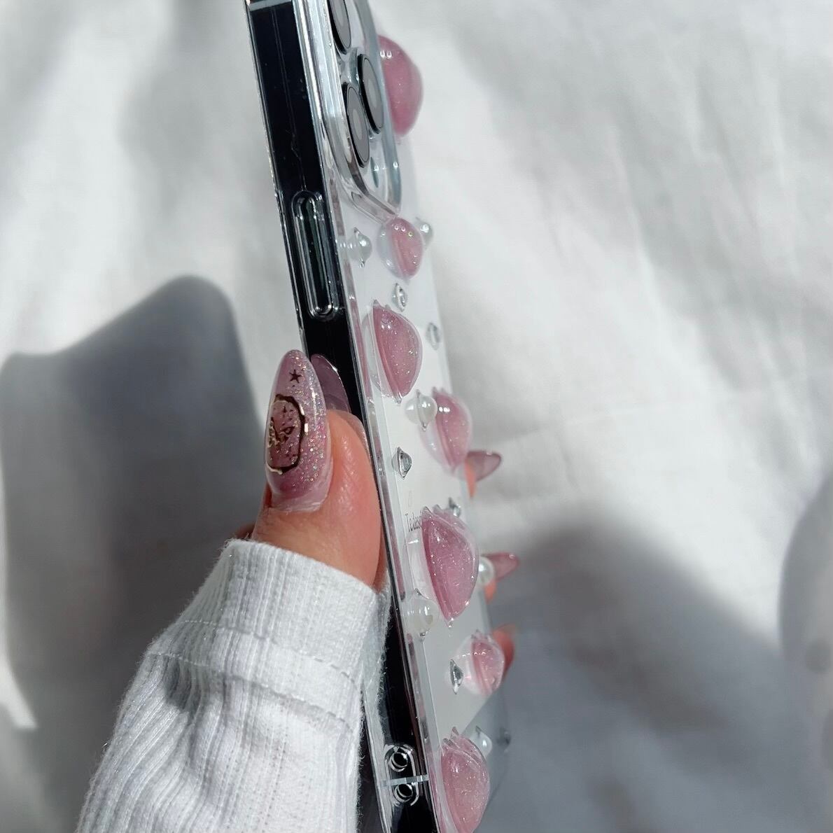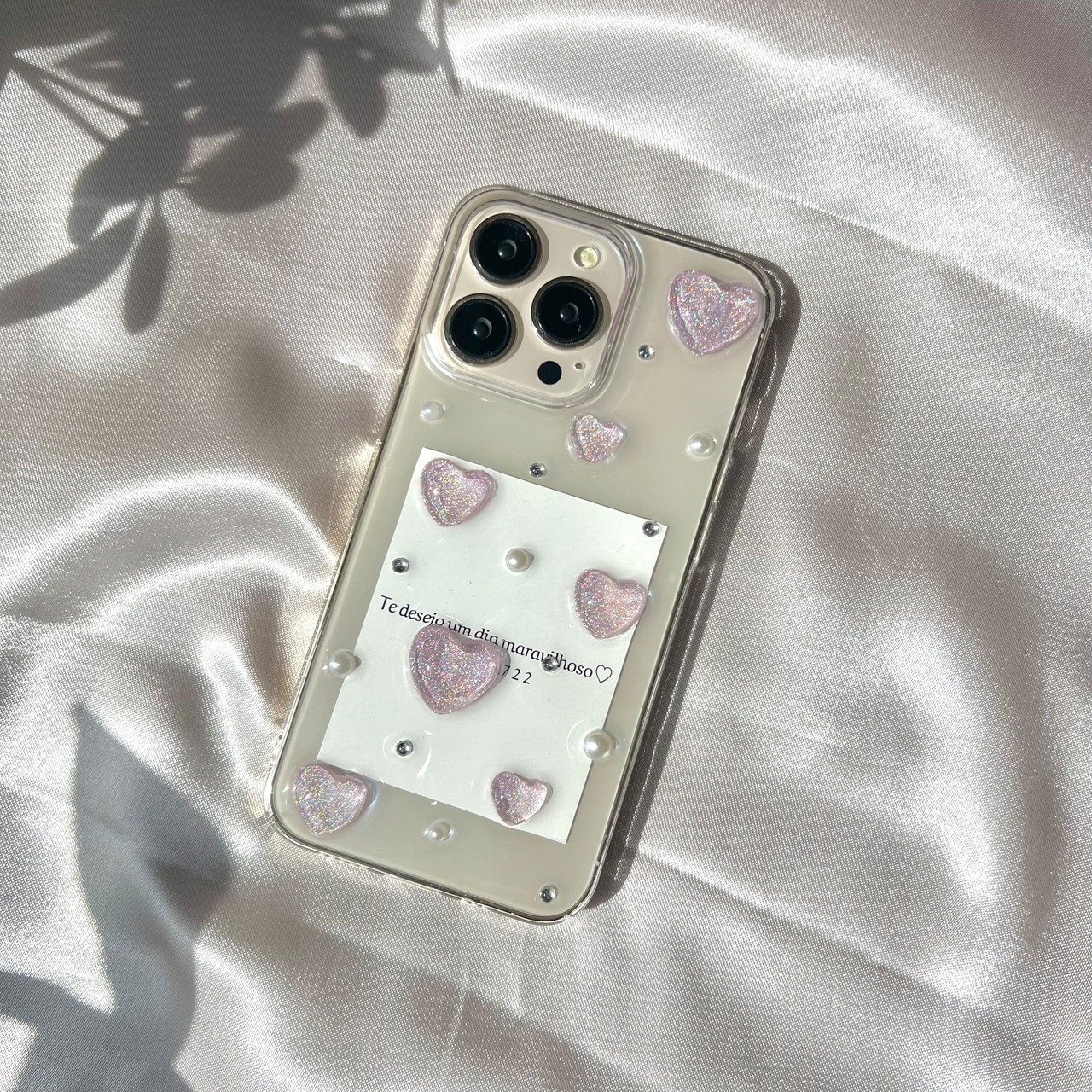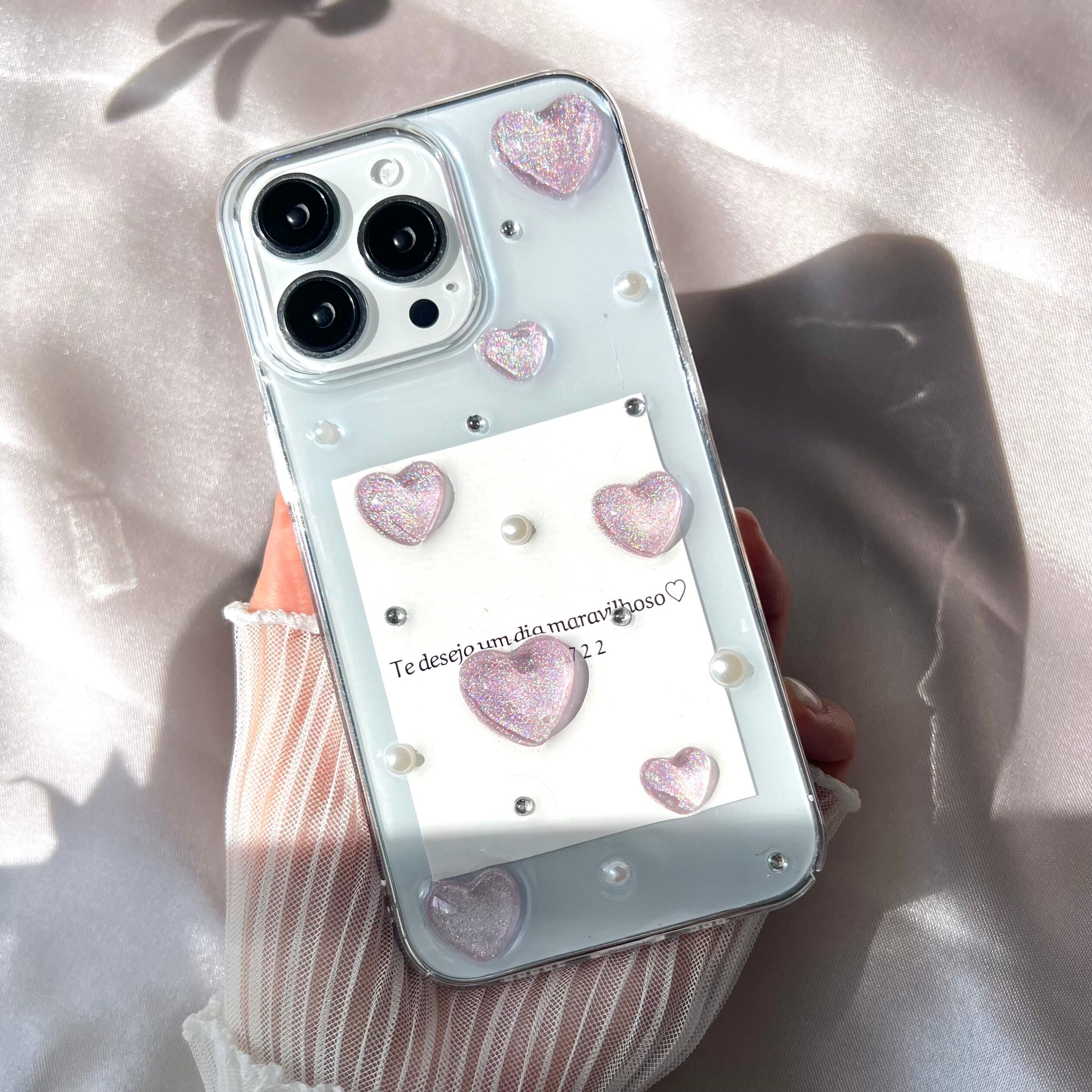 透明感たっぷりのクリアケースに、ぷっくり立体のピンクハートとビジュー、パールを散りばめました。