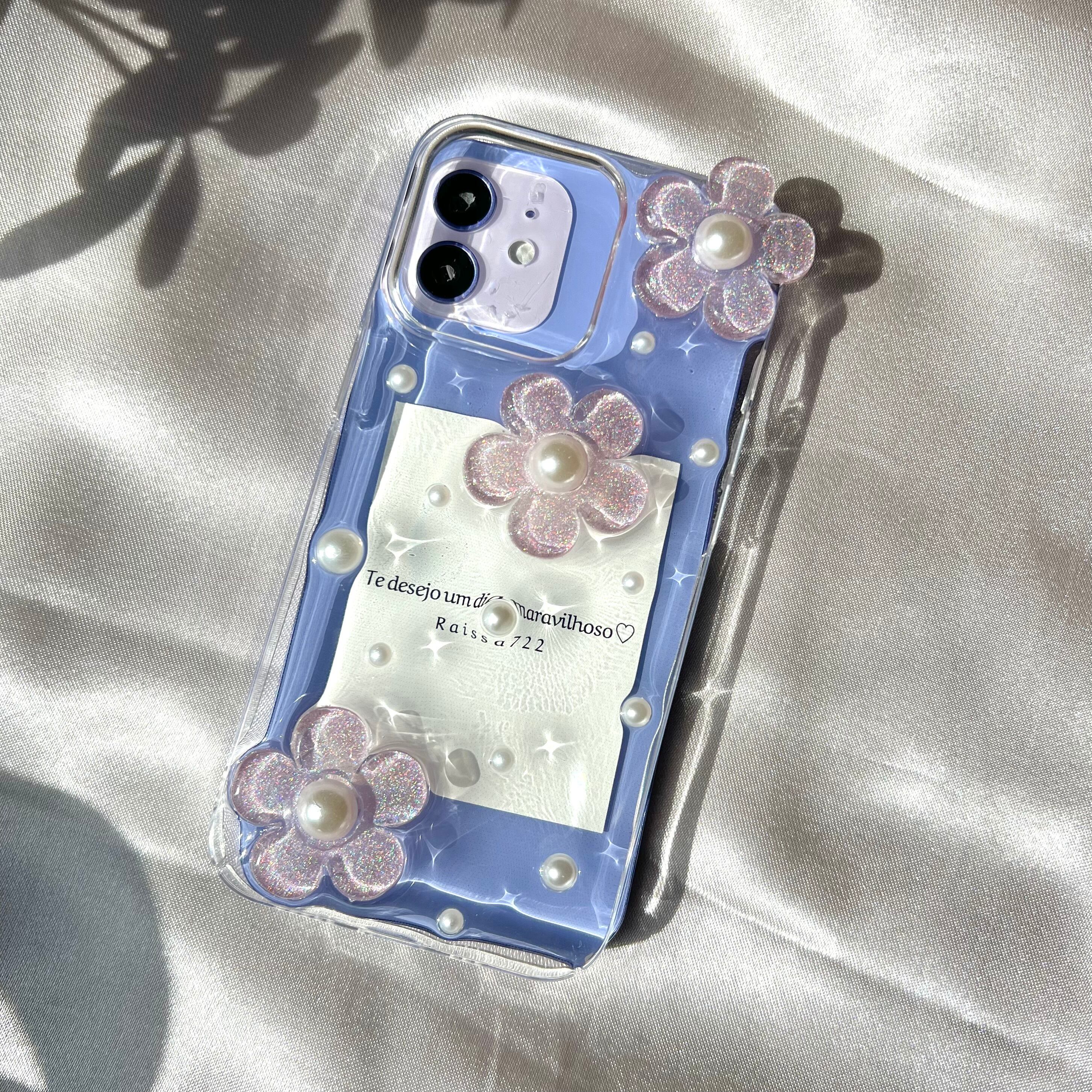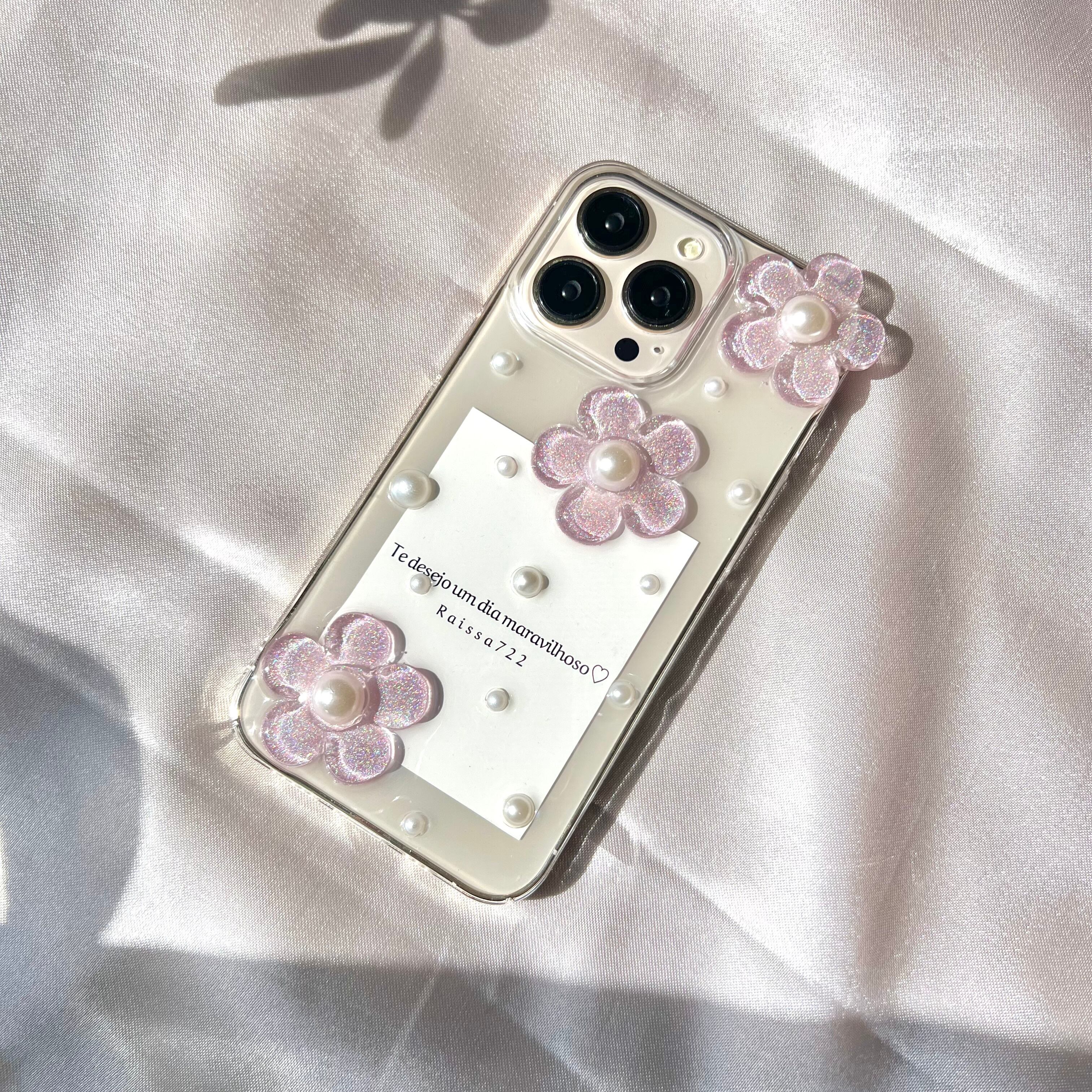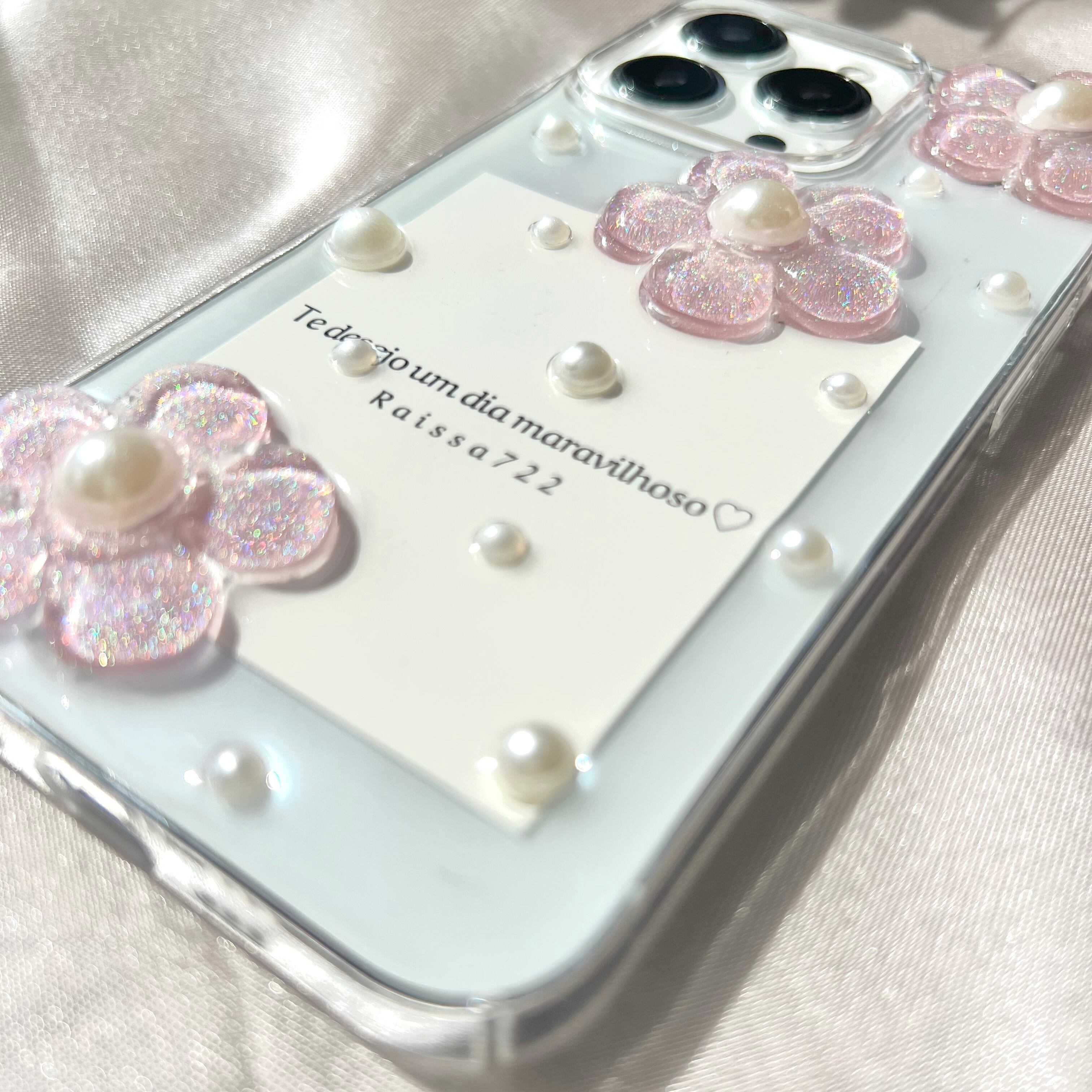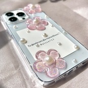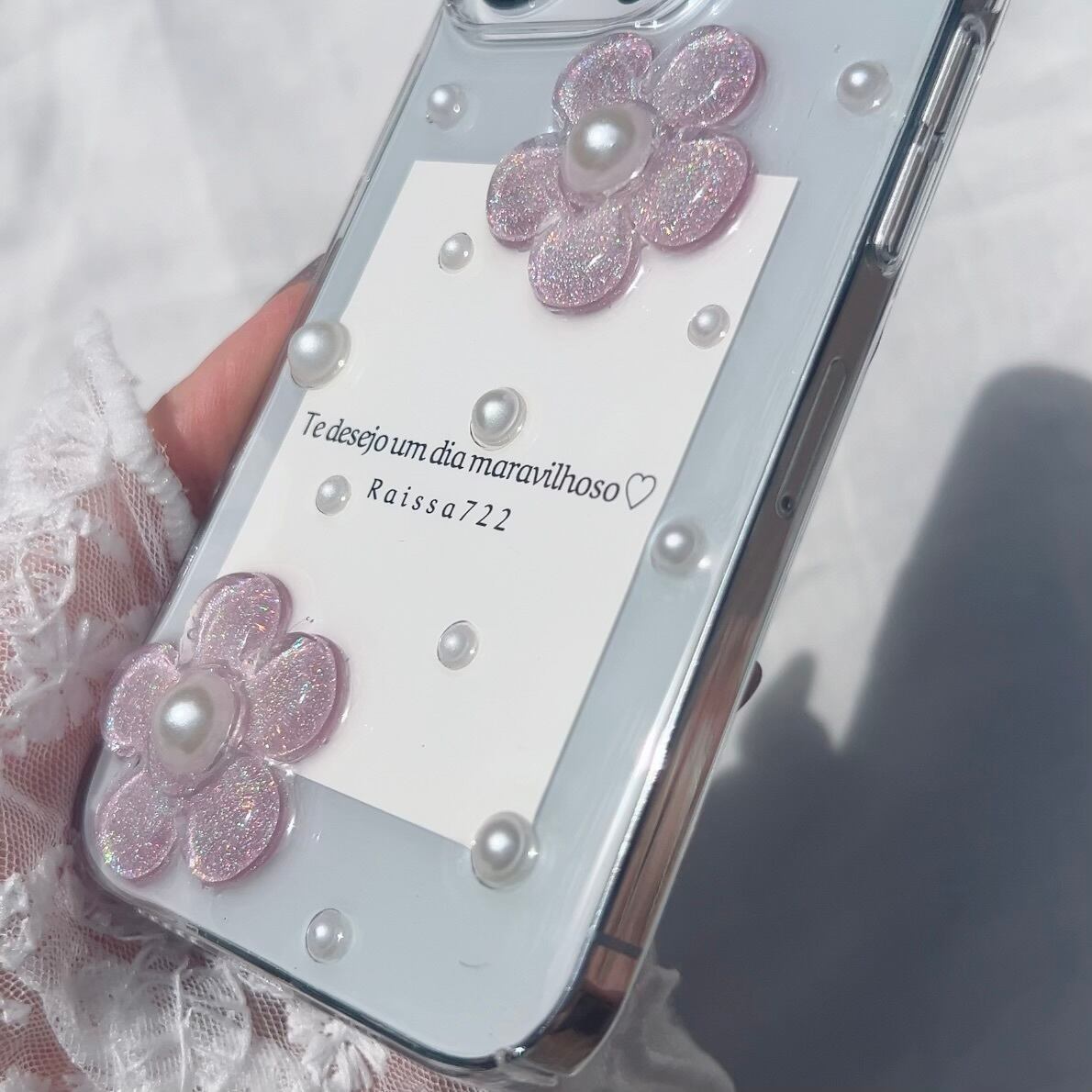 透明なケースに、ぷっくりとしたピンクのお花とパールを