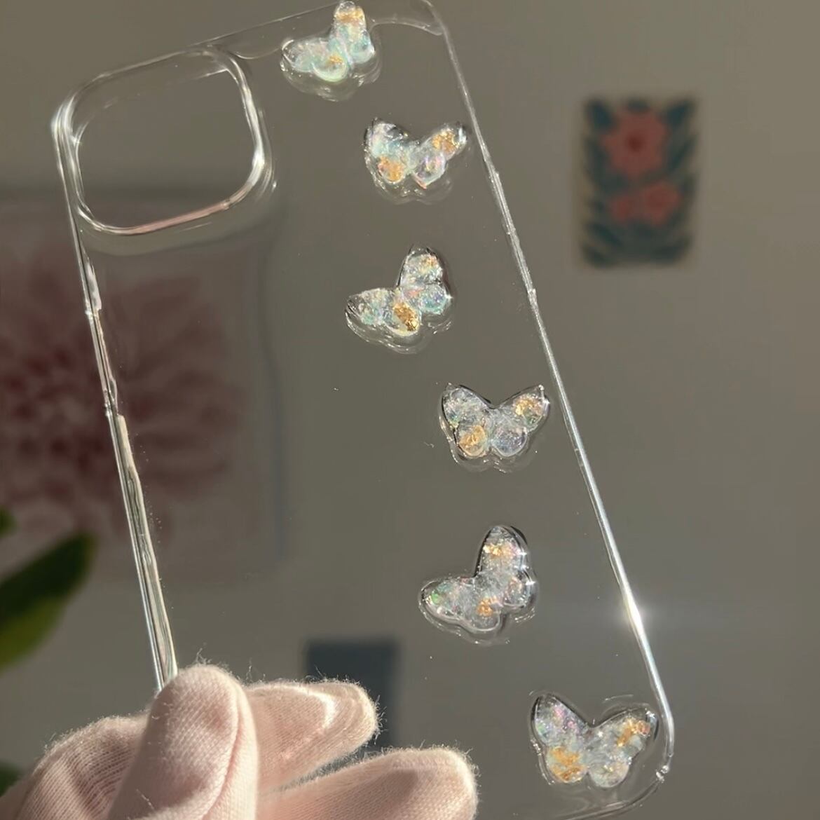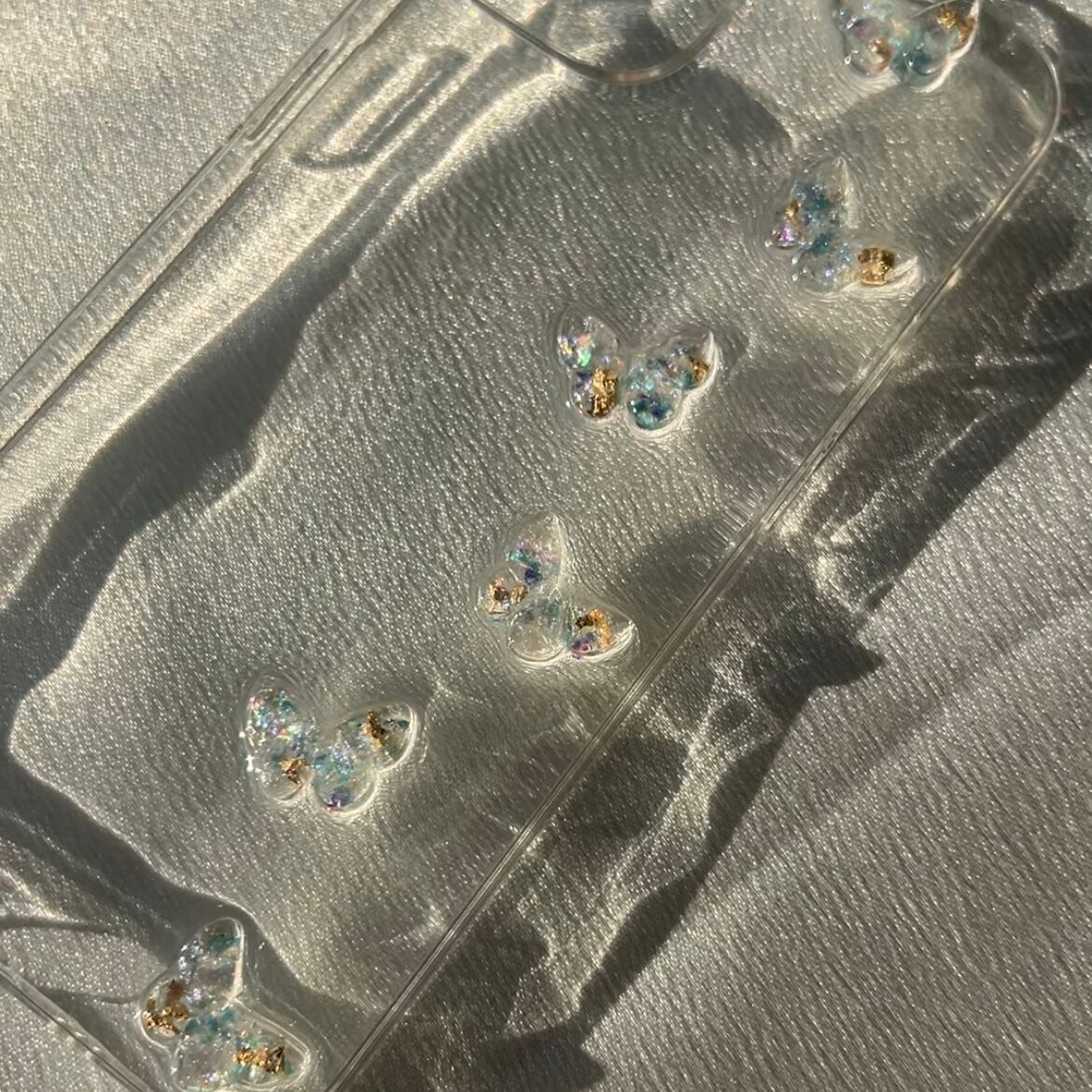 透明感のあるクリアケースに、ラメ入りの立体蝶々
