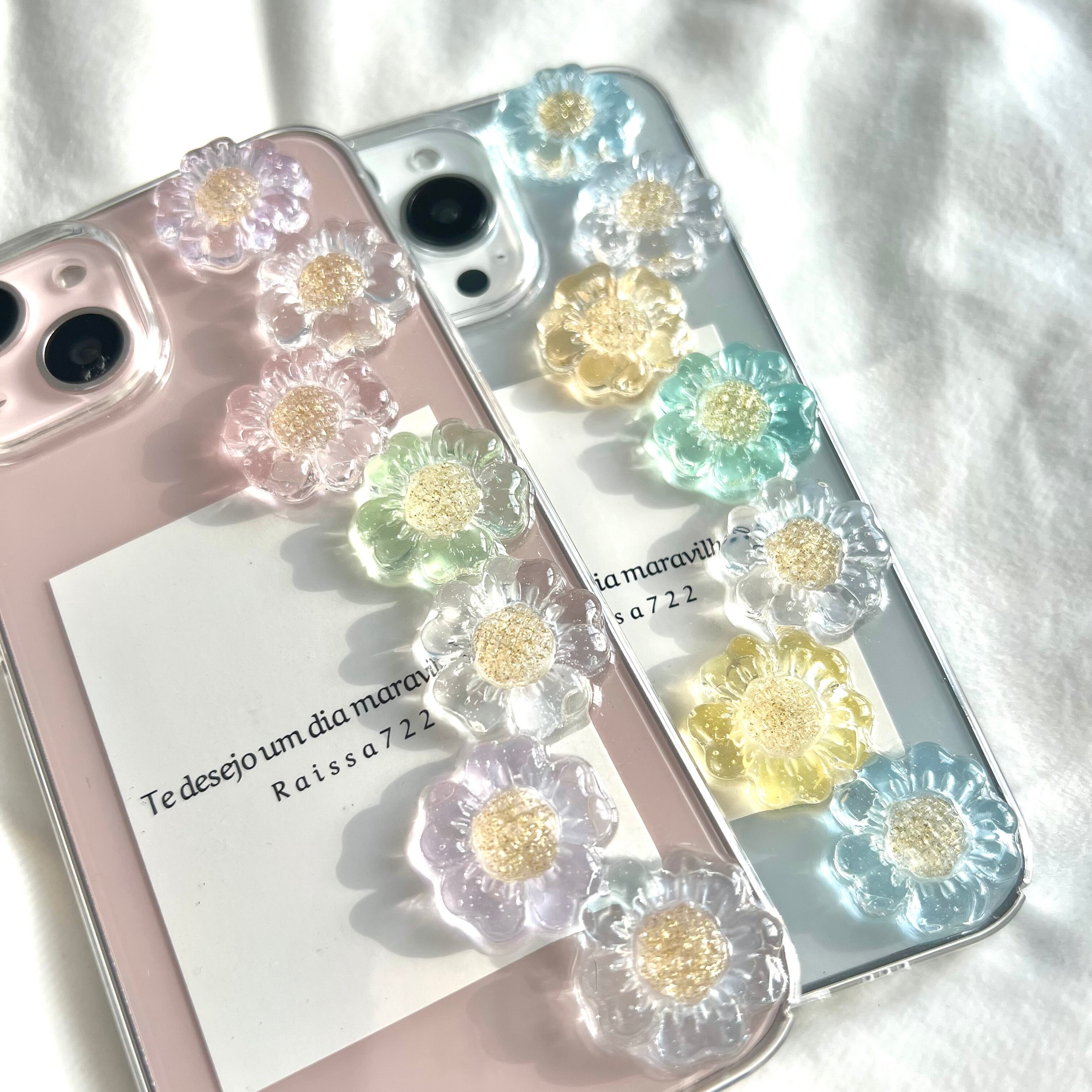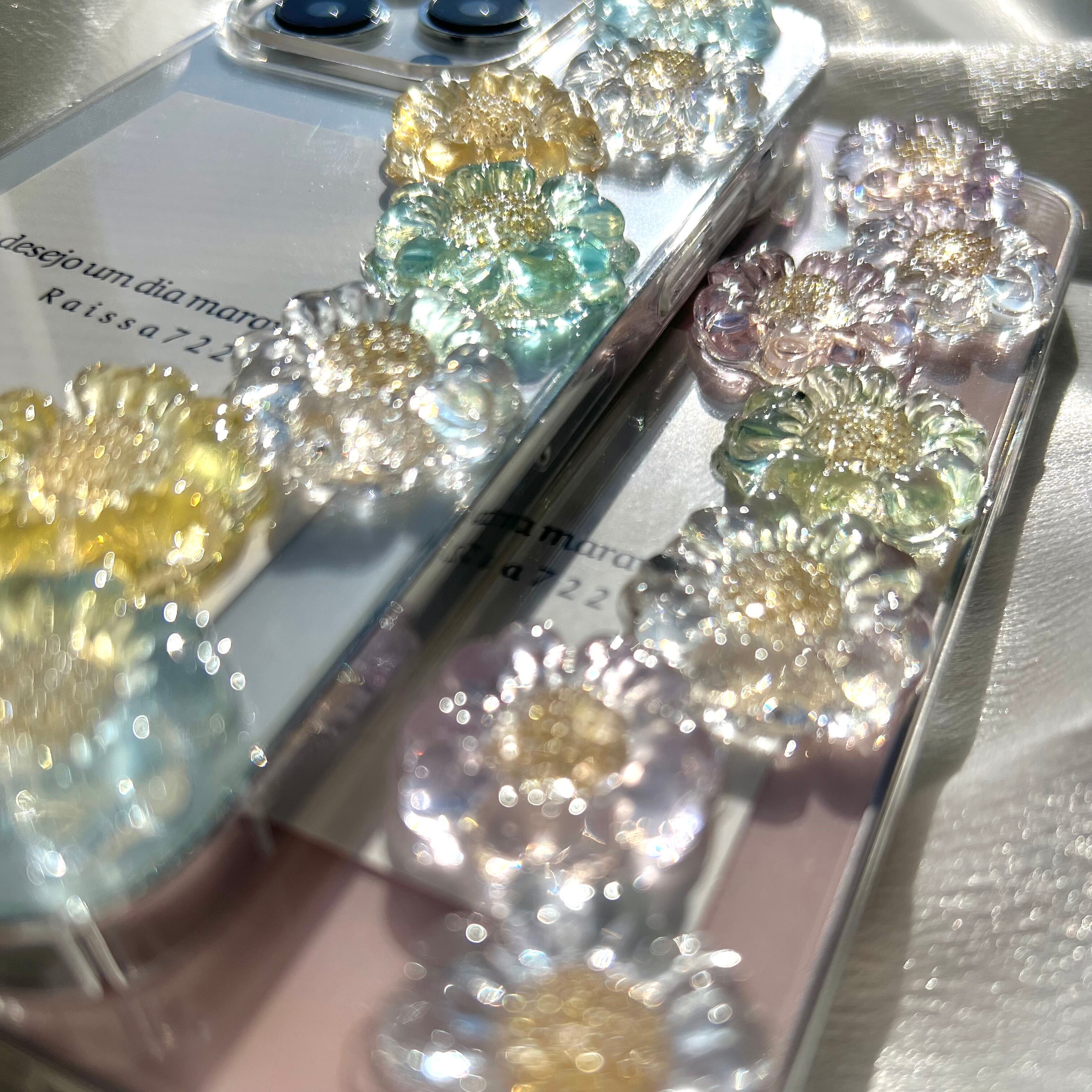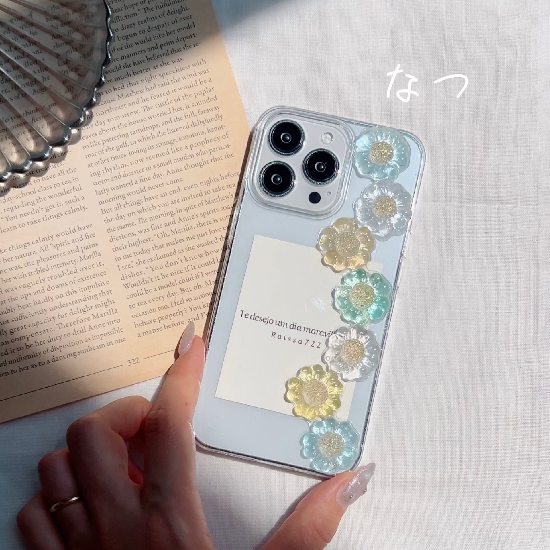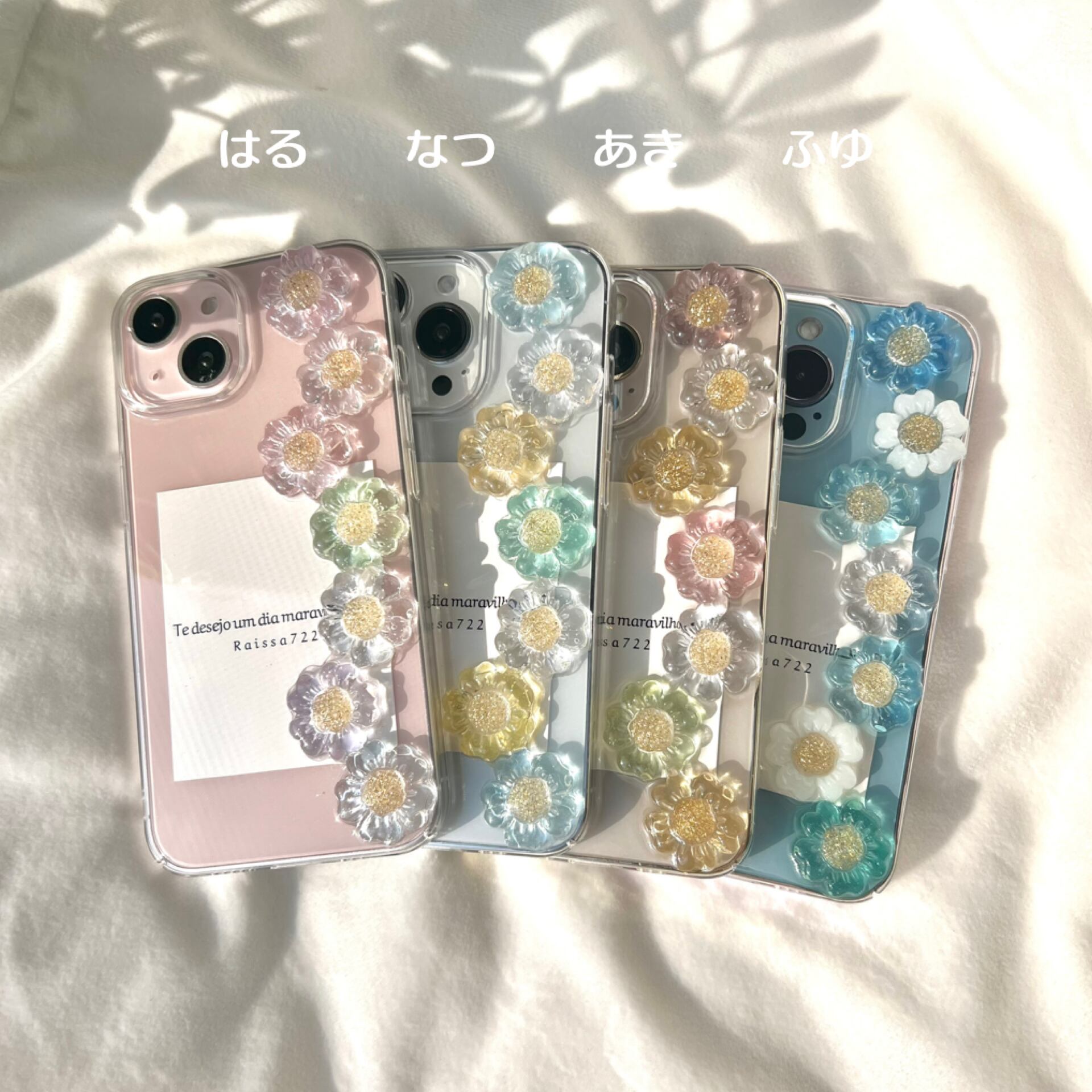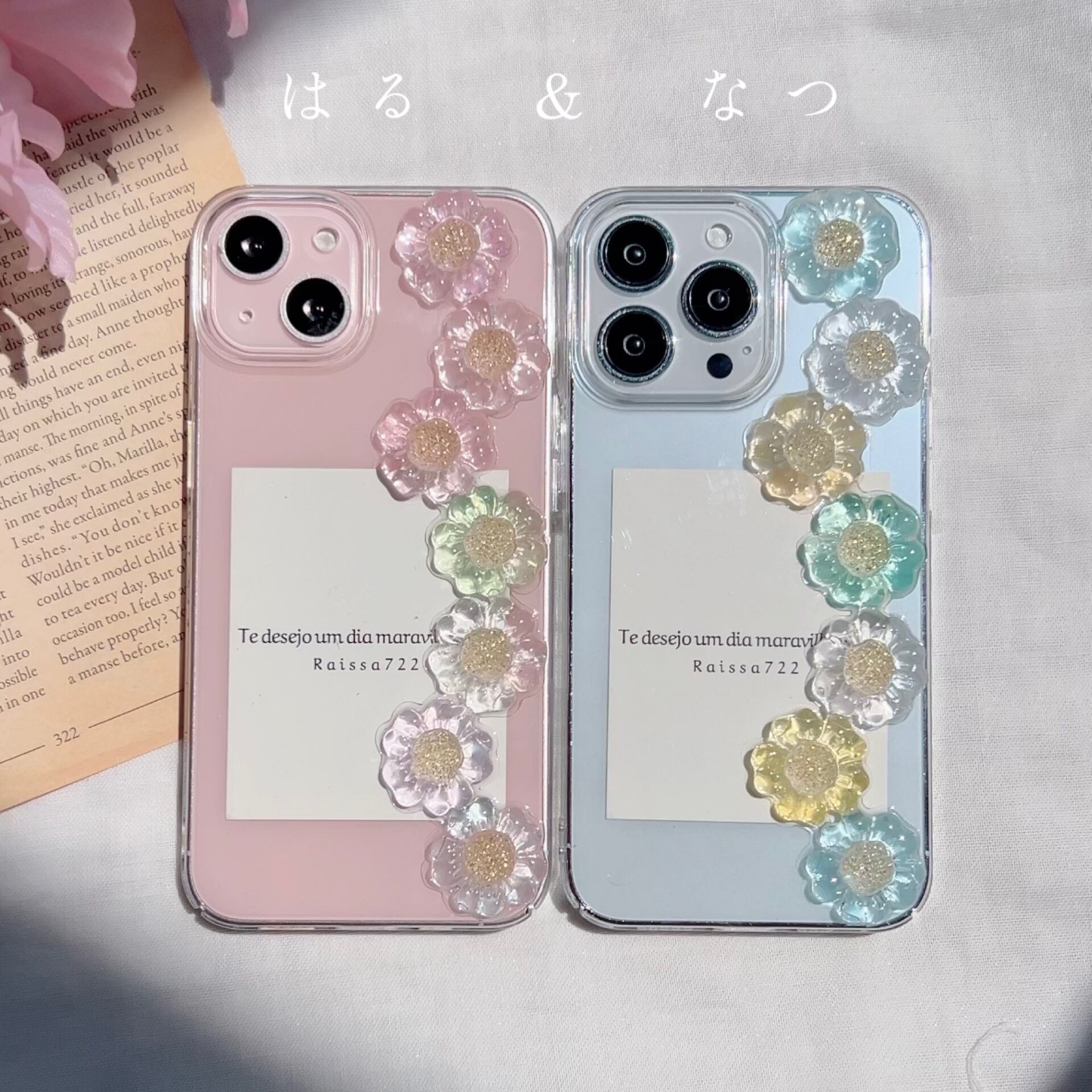透明感のあるクリアケースに、ぷっくり立体の春カラー、夏カラーのお花を散りばめたスマホケース!
