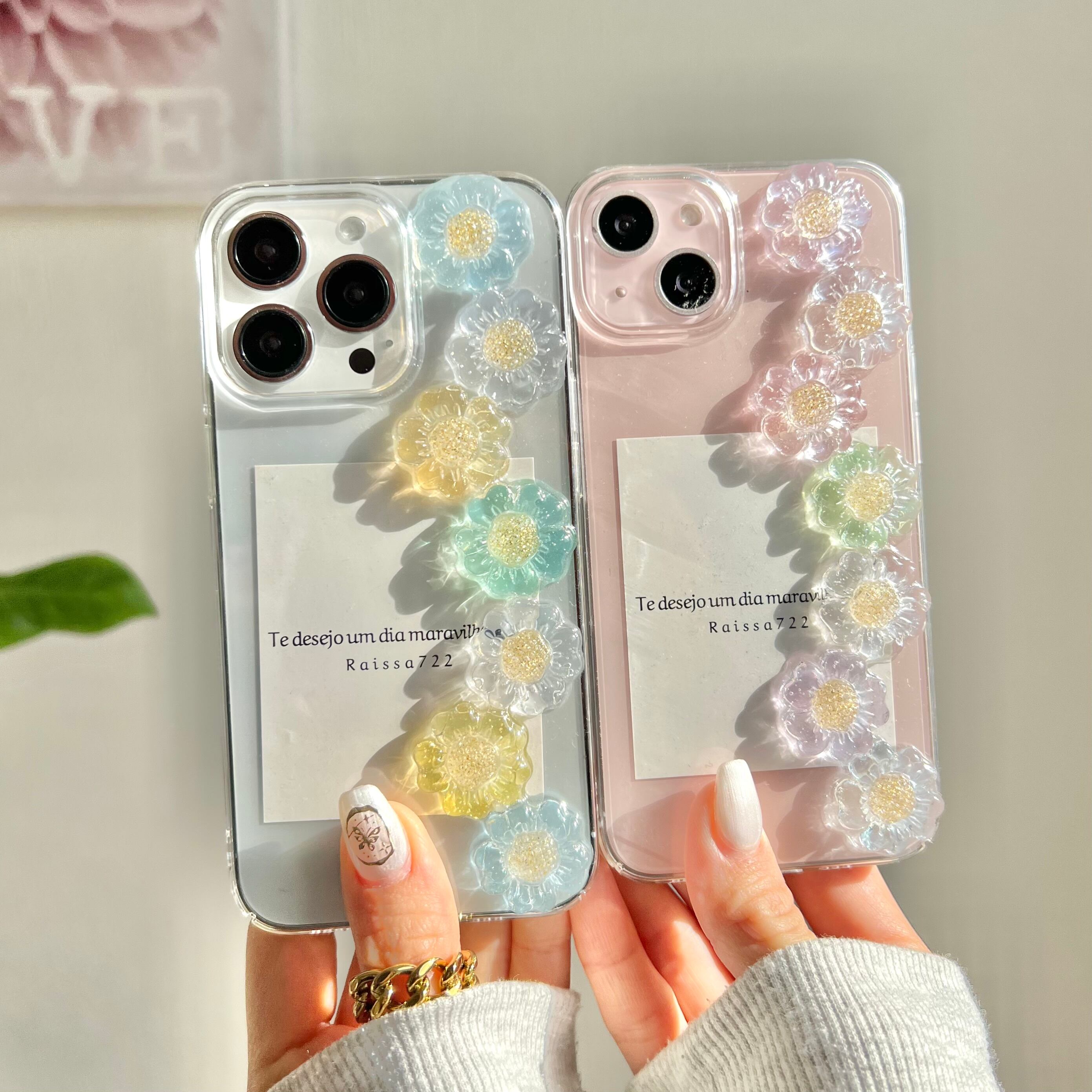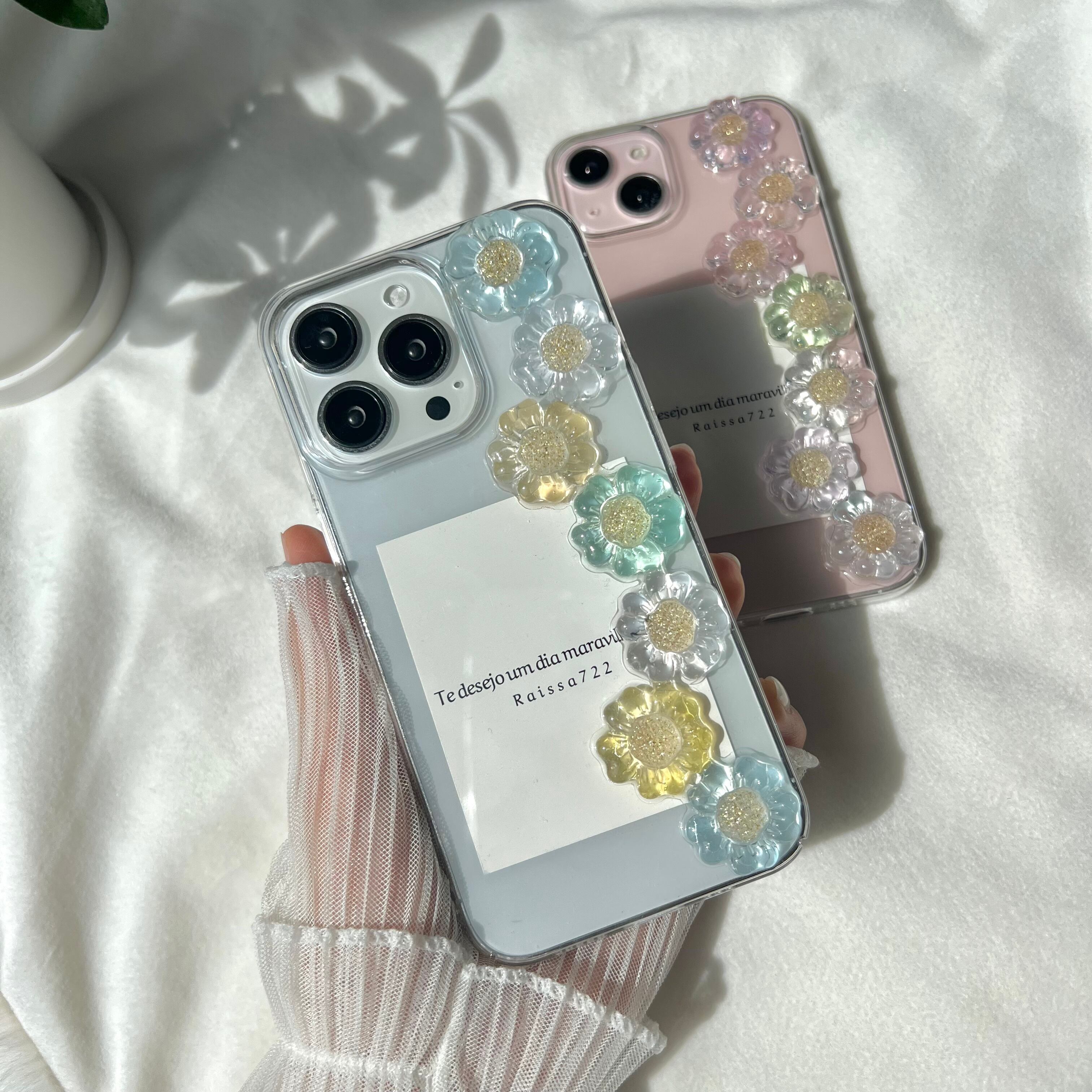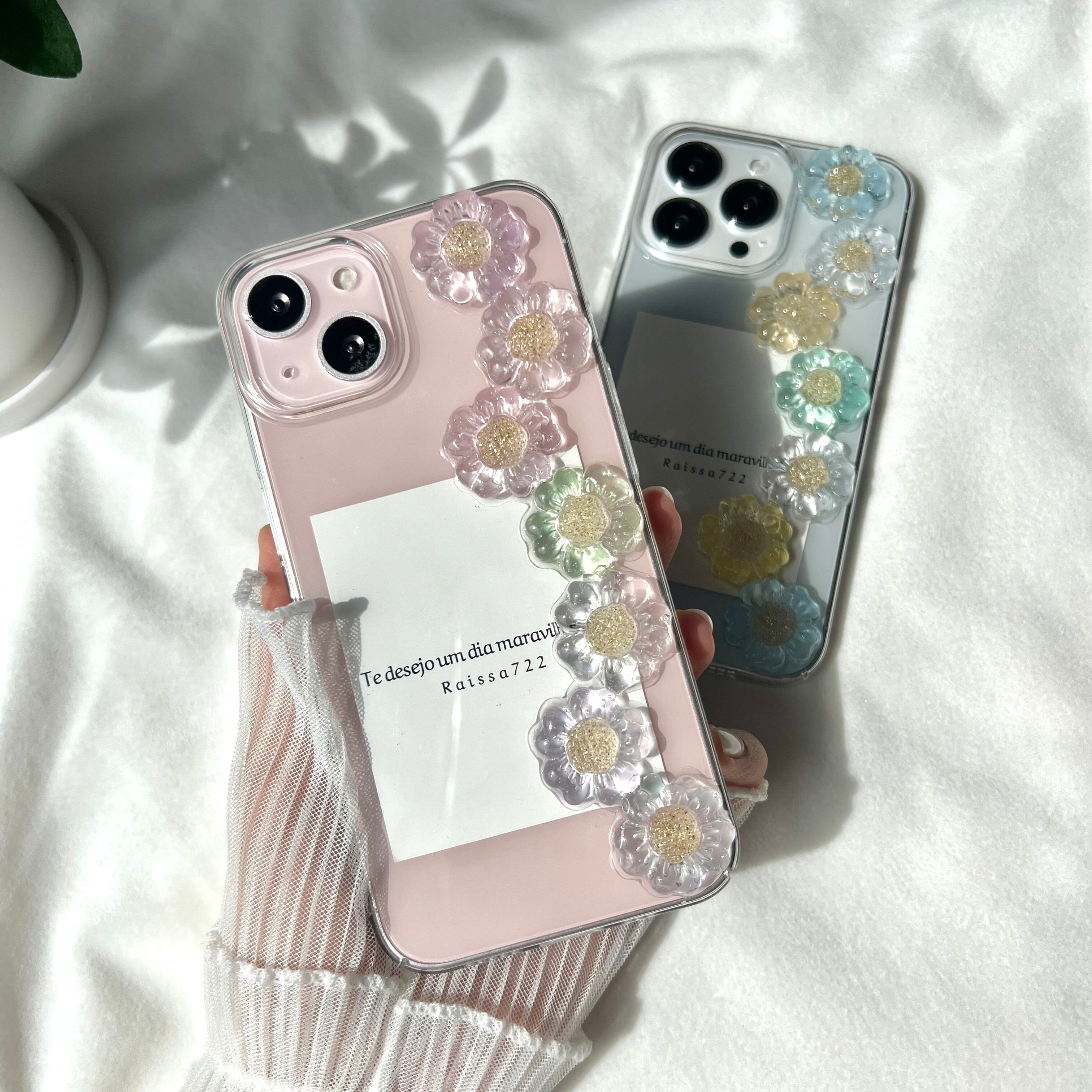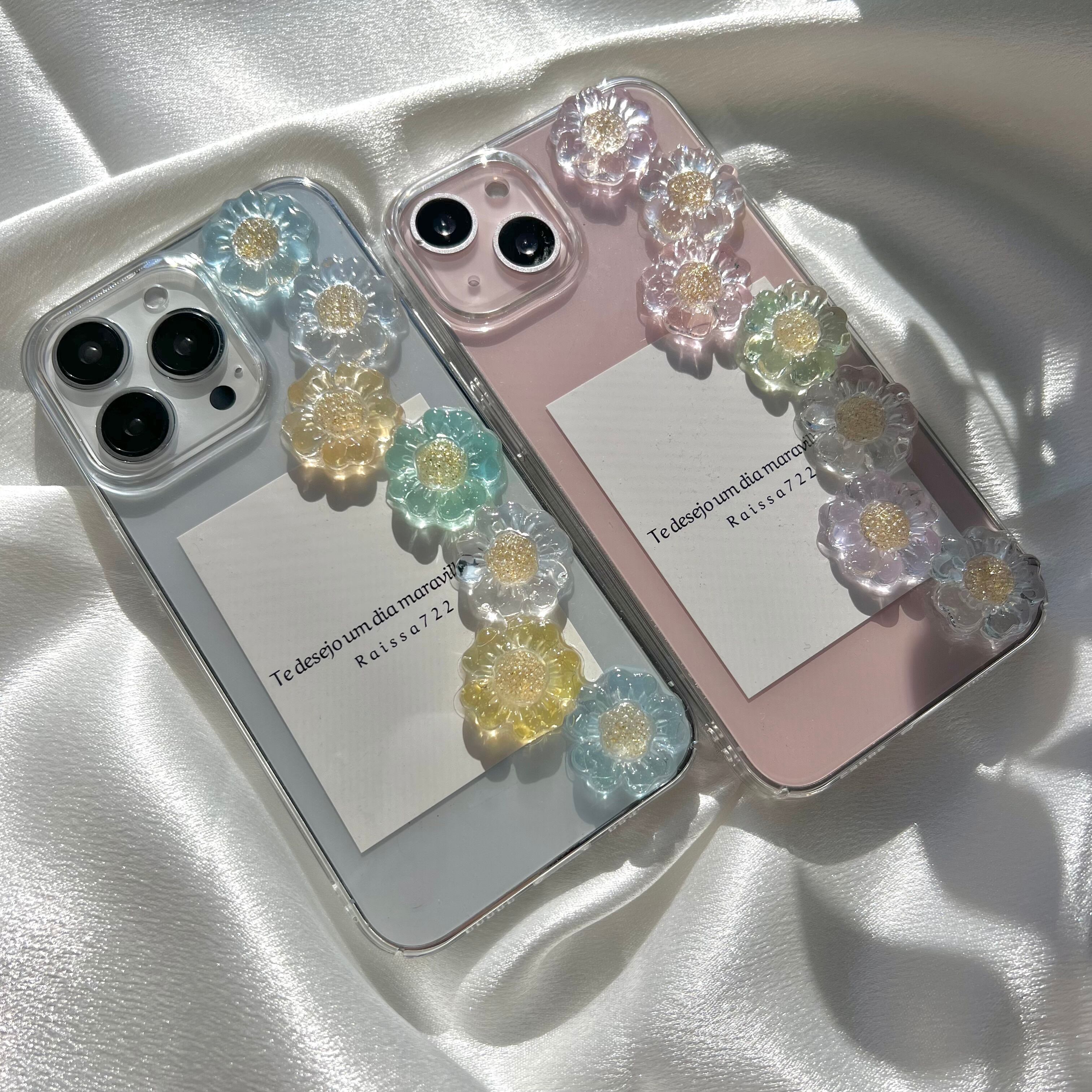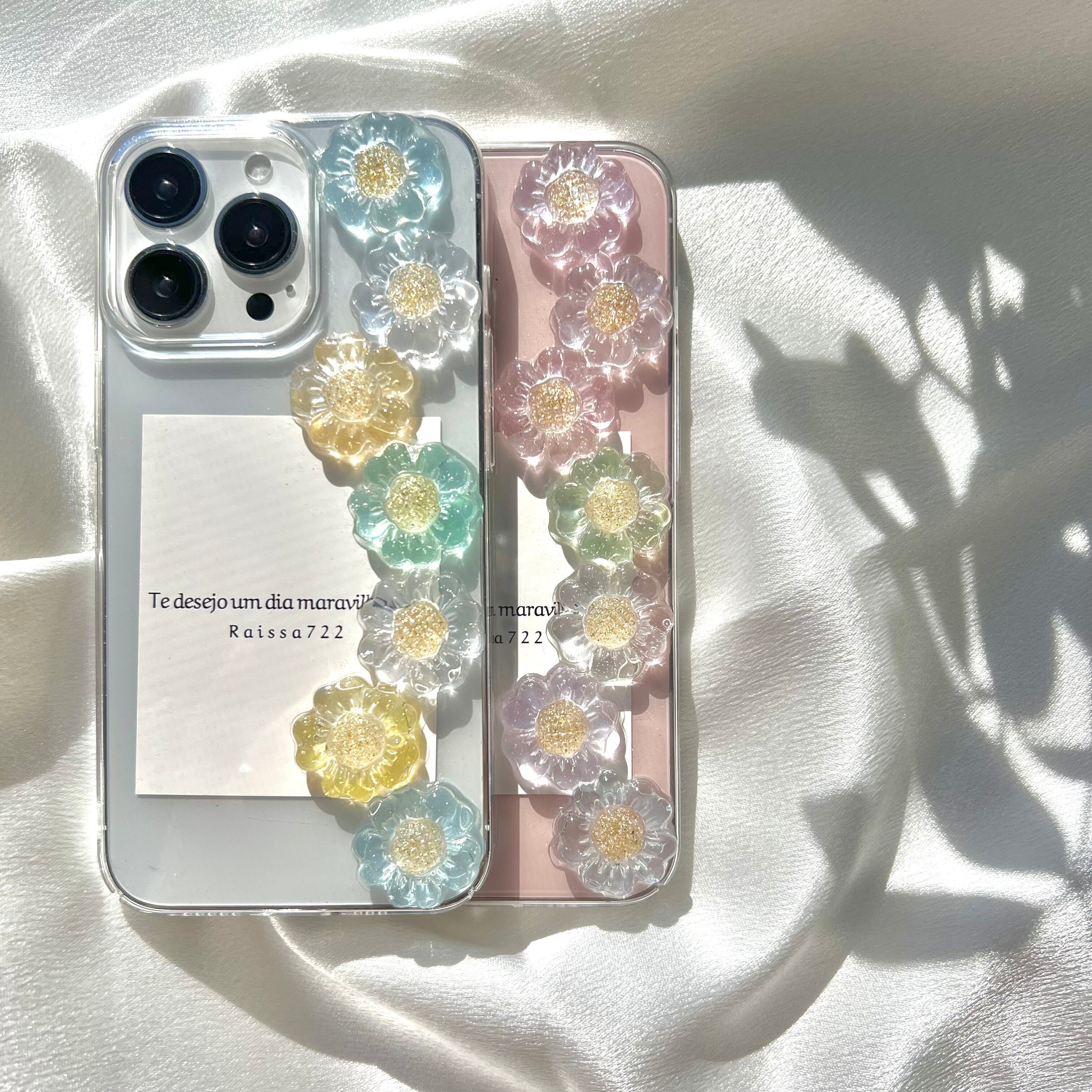 透明感のあるクリアケースに、ぷっくり立体の春カラー、夏カラーのお花を散りばめたスマホケース!
