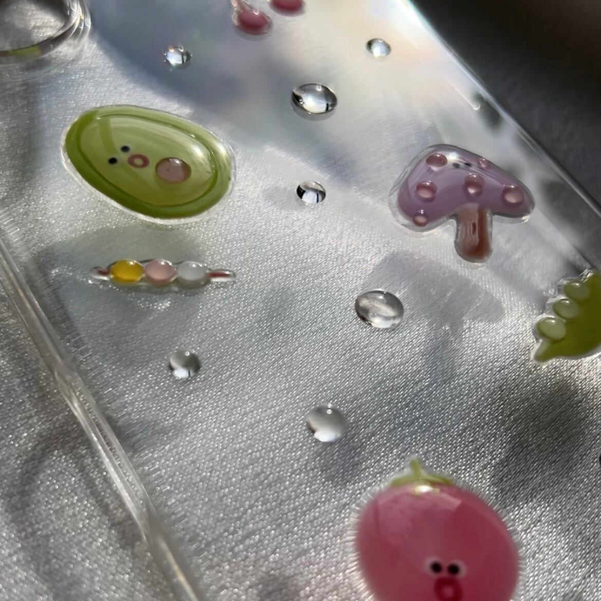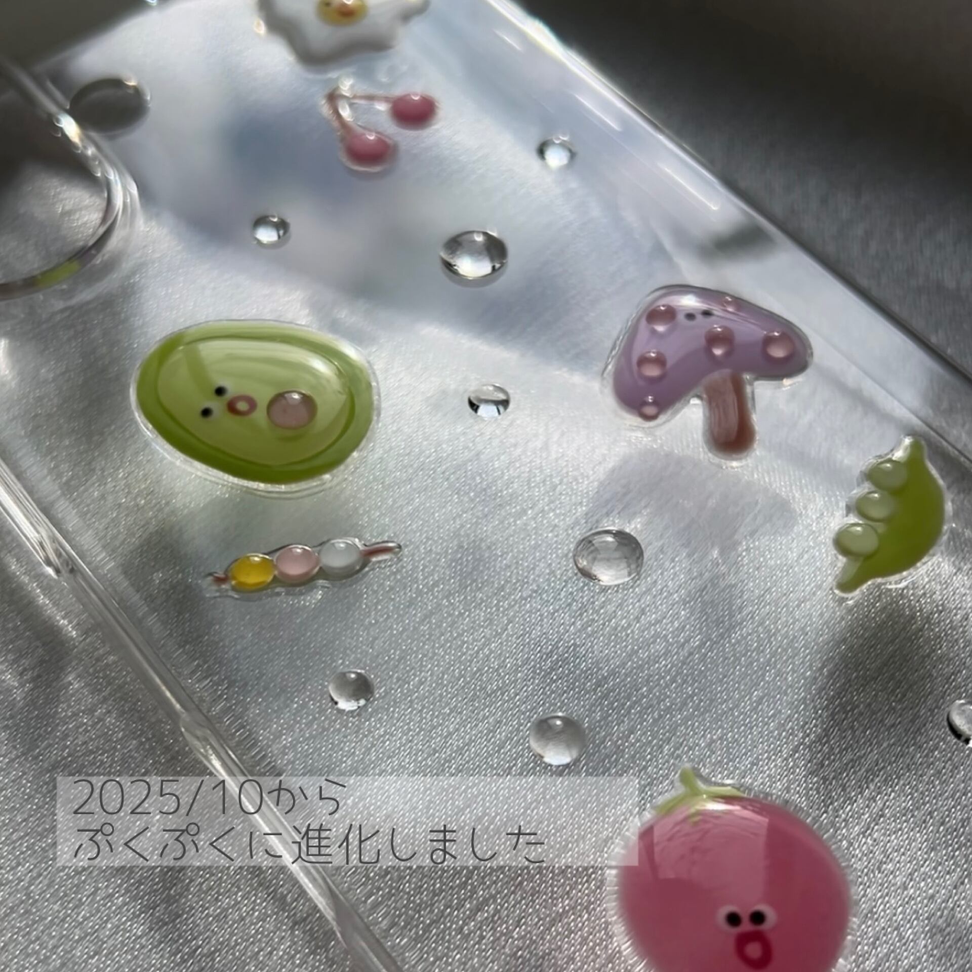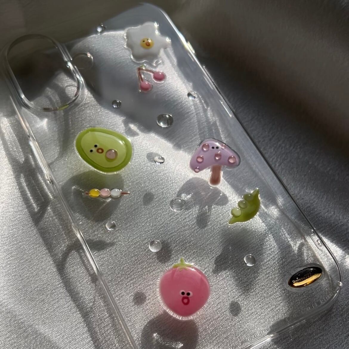 透明感のあるクリアケースに、ぷくぷく立体の“食べものキャラ”をのせた大人かわいいデザイン!